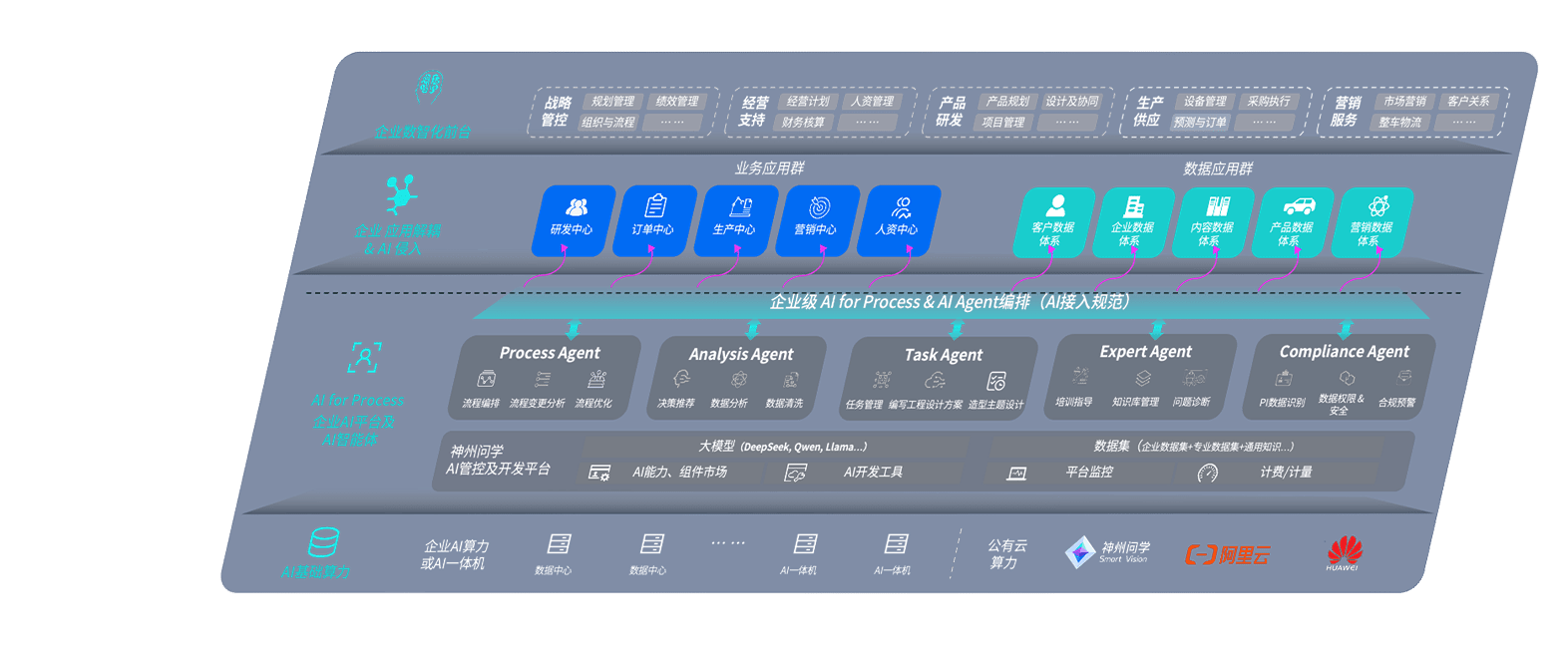 端到端的一站式AI工作空间深度融合了从企业战略规划到日常经营的全流程业务板块,,定向解决车企内部领域多、、部门多、、链条长、、场景碎片化等难题,,,,支持车企快速构建以AI为核心的生产力写作体系,,,实现任务执行与AI能力的无缝集成与交互